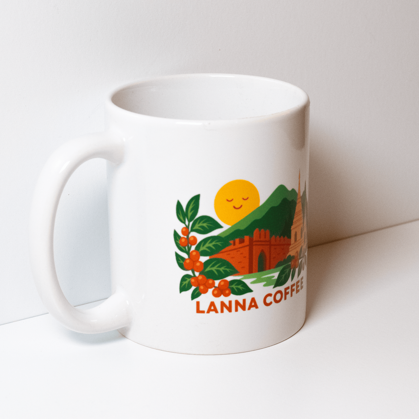 The Lanna Sunrise Mug brings a slice of Northern Thailand to your morning routine. A warm sunrise, lush green mountains, old city walls, temple silhouettes, and coffee branches come together in a custom illustration that celebrates where Lanna Coffee’s story begins.